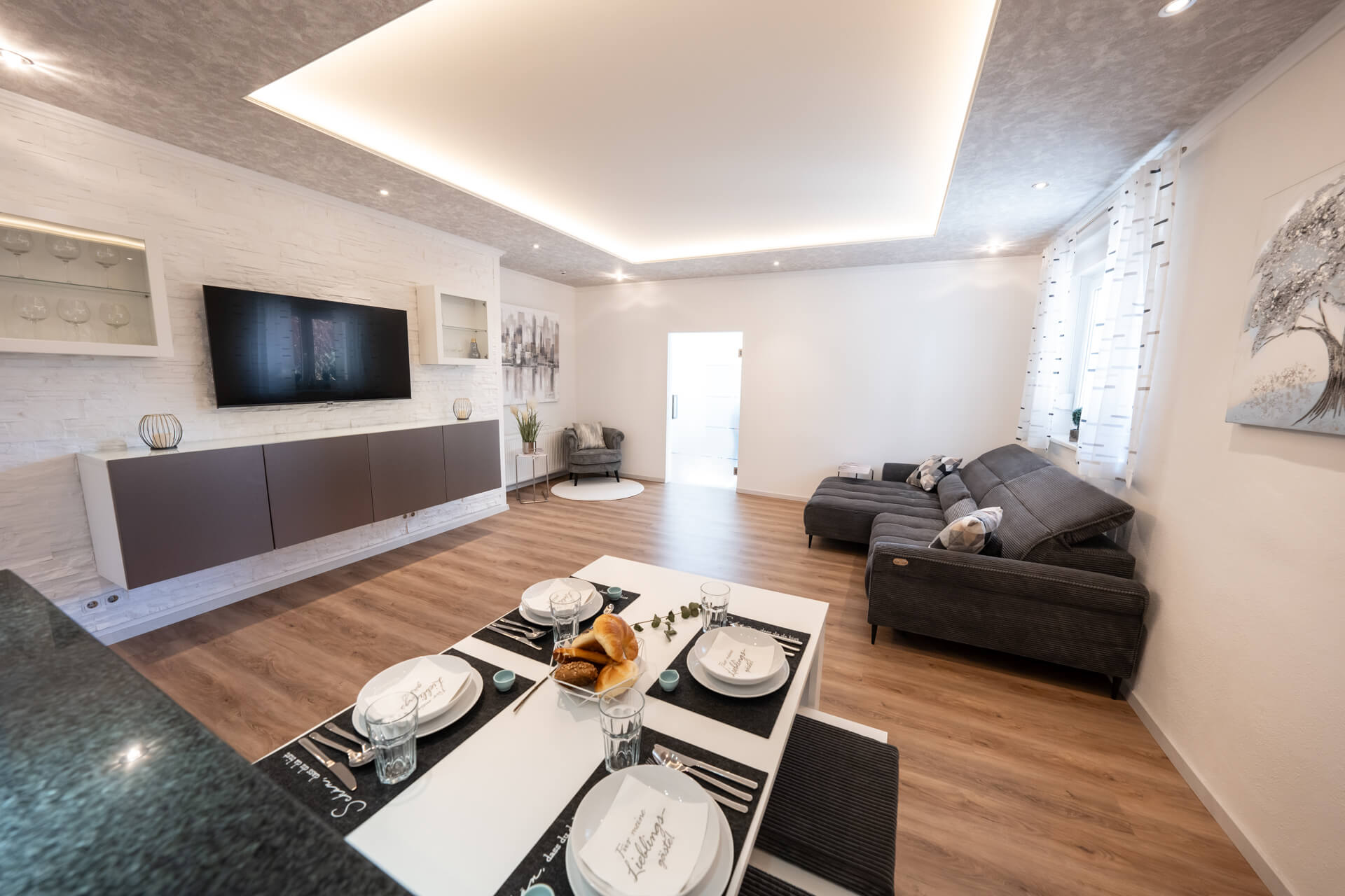 Willkommen im Ring48 – dein stilvoll ausgestattetes Apartment in zentraler Lage für zwei bis vier Personen in Bayreuth. Auf 69 m2 erwartet dich eine top bestückte Küche mit hochwertigen Miele- und WMF-Geräten, ein großzügiger, offener Ess- und Wohnbereich mit 55 Zoll Smart-TV und ein geschmackvolles Schlafzimmer mit bequemem 2x2 m Bett.